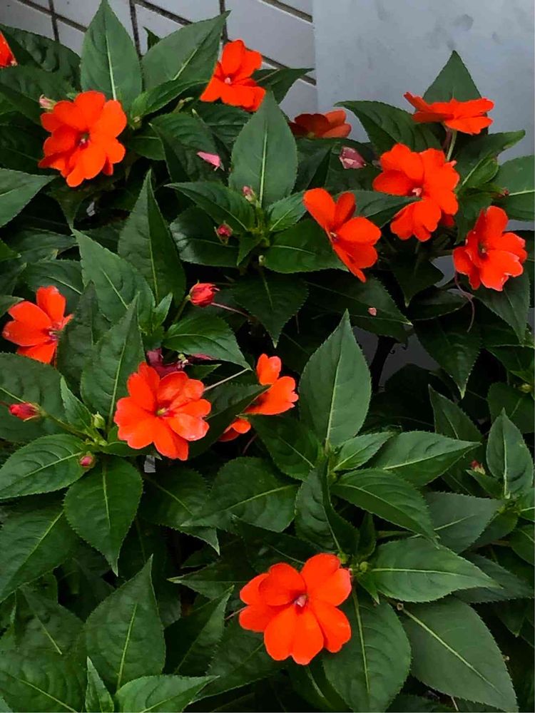 ニューギニアインパチェンスは葉っぱがもっとギザギザして細長いけど、これは葉っぱに丸みがあります。ニューギニアかな?