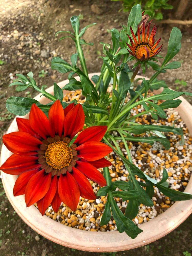 近所の人にムスカリの球根をお裾分けしたら、ガザニアの苗を頂きました💕😊