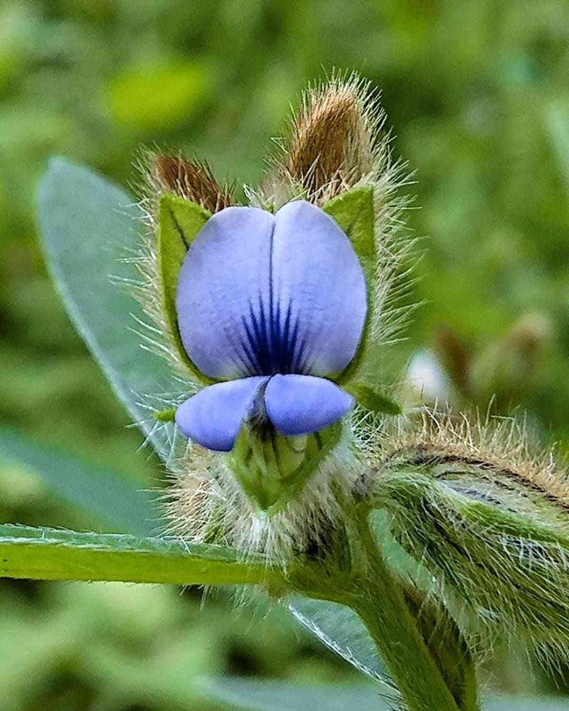 マメ科タヌキマメ属の1年草。日当たりがよく、やや湿ったところに生える。茎や葉などに褐色の長い毛が多い。葉は広線形。花期は7~10月。花は枝先に総状につき、青紫色で長さ約1㎝。萼は大きく、褐色の毛が密生してよく目立ち、深く2裂し、さらに上裂片は2裂、下裂片は3裂する。花は午後開いて夕方にはしぼむ。花は10~20個くらいつくが、開花しているのはたいてい1つか2つだけ。花のあと萼は大きくなり、豆果をすっぽり包む。豆果は長さ1~1.5㎝の長楕円形。