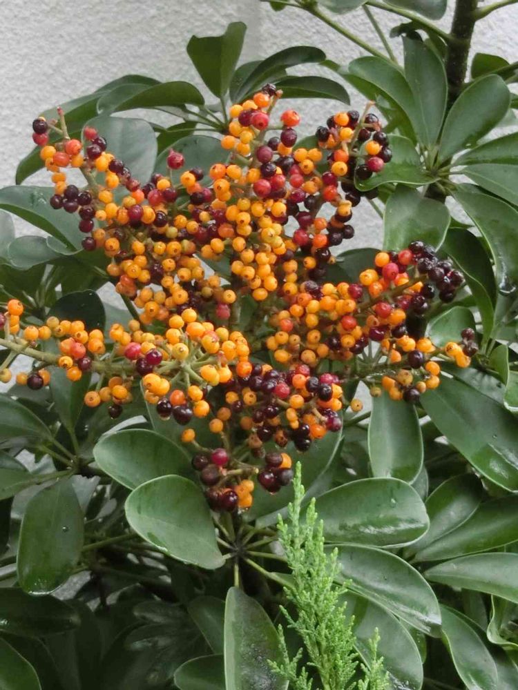 艶のある濃い緑の葉が放射状に広がるこの木は観葉植物としてよく見かけますが、実がなっているのは滅多に見ま