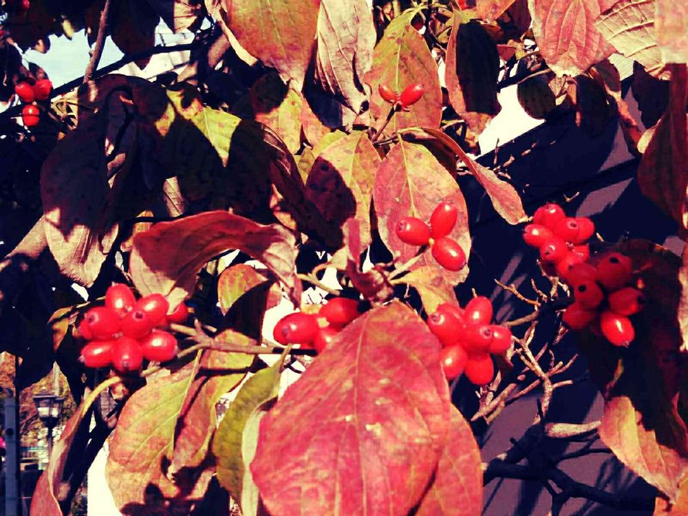 ご近所のお庭の、花水木の紅葉🍁と実がだんだん赤く成り、キラキラ✨と実が光っています。