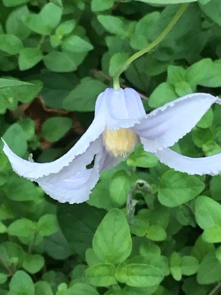 クレマチス パステルブルーが初めて咲きました💕つる性だと思って買ったら、草状でどうしたらいいかわからなかったけど、何とか一輪ひっそりと咲いてました😊