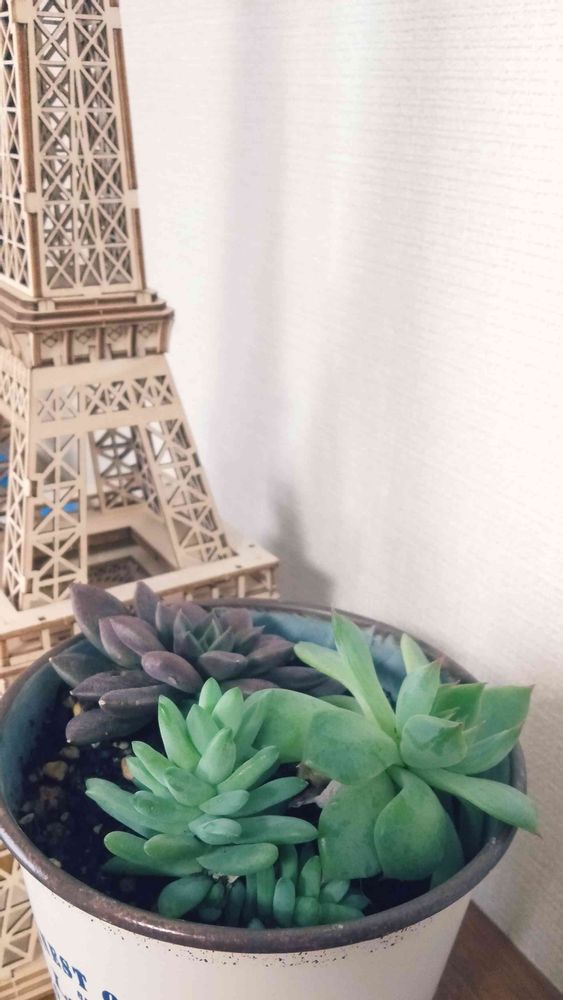 後ろに夫の組み立てたエッフェル塔を置いておしゃれを目指す