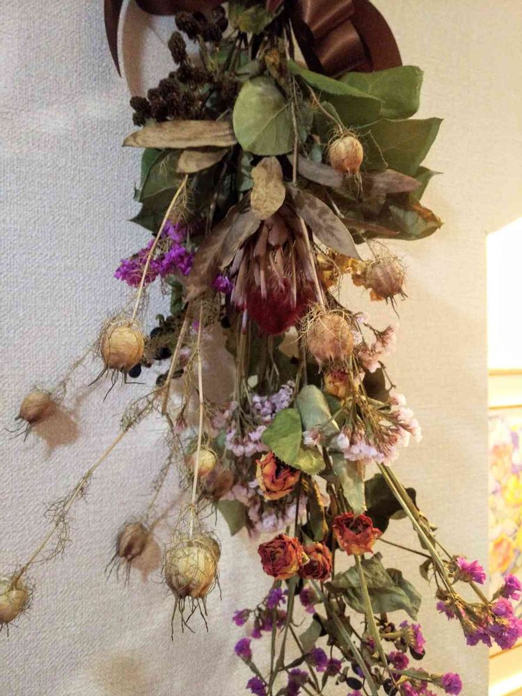 生の花束からドライにした物とドライフラワーのスワッグを解体して作り替えました💐