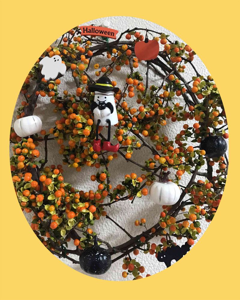 リース触ると葉っぱの方がポロポロ取れてハロウィン飾り🎃をつけるのがたいへんでした😅