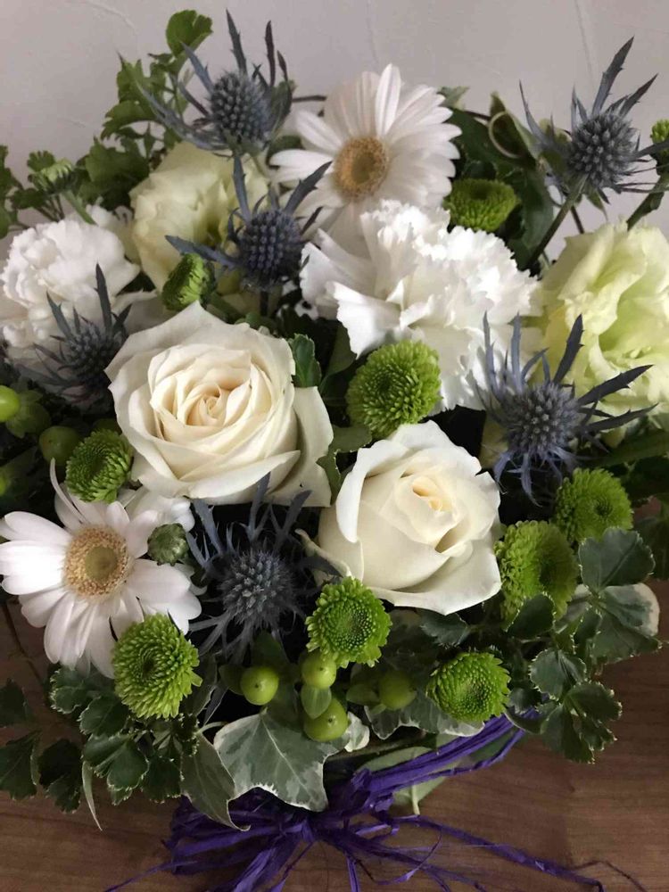 フラワーアレンジメント、挑戦してみました。白とグリーンで低めにまとめてみました。玄関を落ち着いた雰囲気で飾ってくれています。