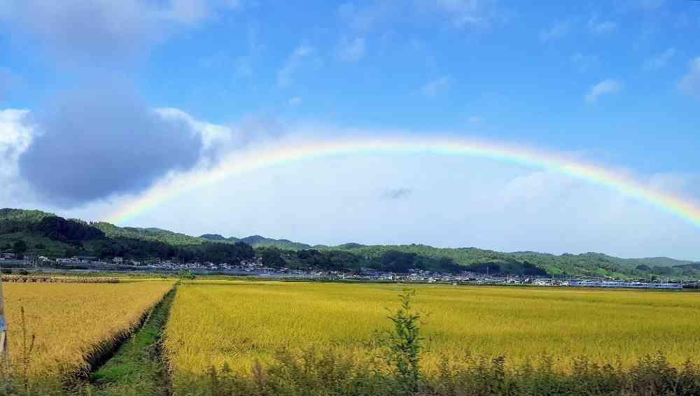 稲刈りを待つばかりの田んぼに虹の橋🌈✨