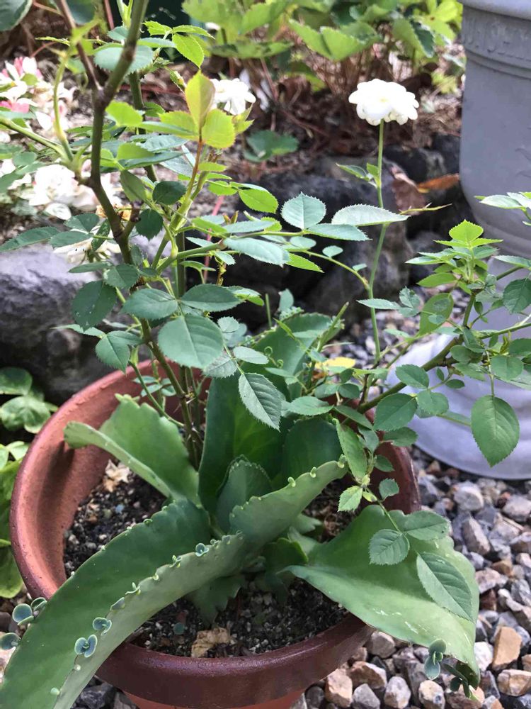 ミニ薔薇の鉢にいつの間にか、子宝草が…