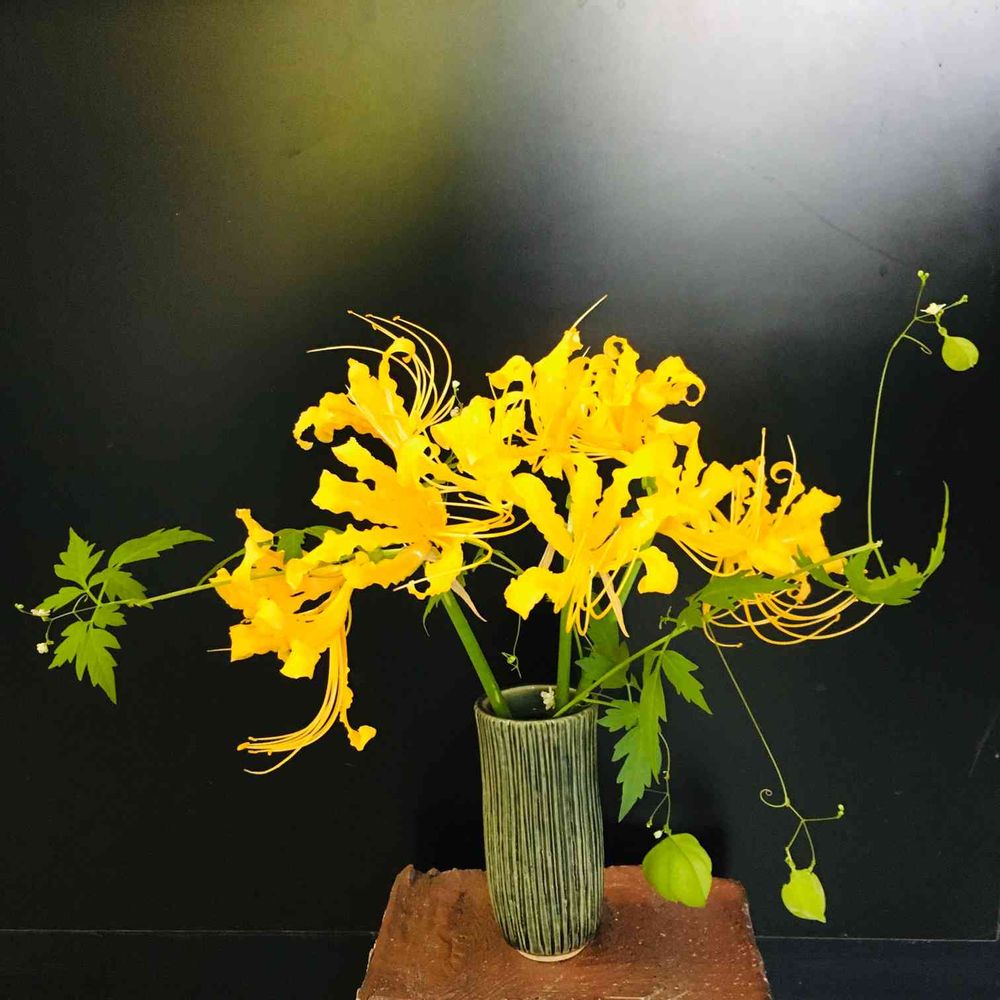 渋い色の花器が、一層 彼岸花の黄色を引き立てていますね。