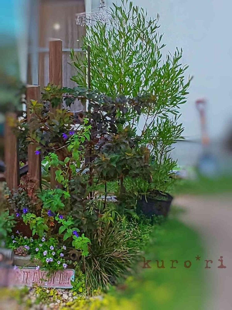 ドドナエア地植えの横に黒いブリキバケツ鉢に植えてるのが初代ドドナエアなの😁でもpinkのフリフリ付かないの💦付くタイプ見つけて地植えにしたらこんな感じに😂枝数多くてこんもりするから形を見ながらバシバシ切ってるよ‼️
