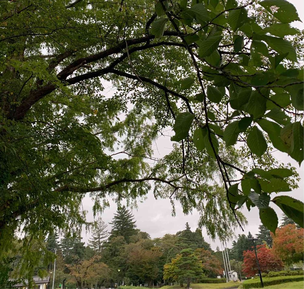 樹木、葉っぱの個性的な形、様々な色合いに惹かれます🍁🍂🍁自然のキャンパスですね。うっとり眺めていたら大粒の雨。