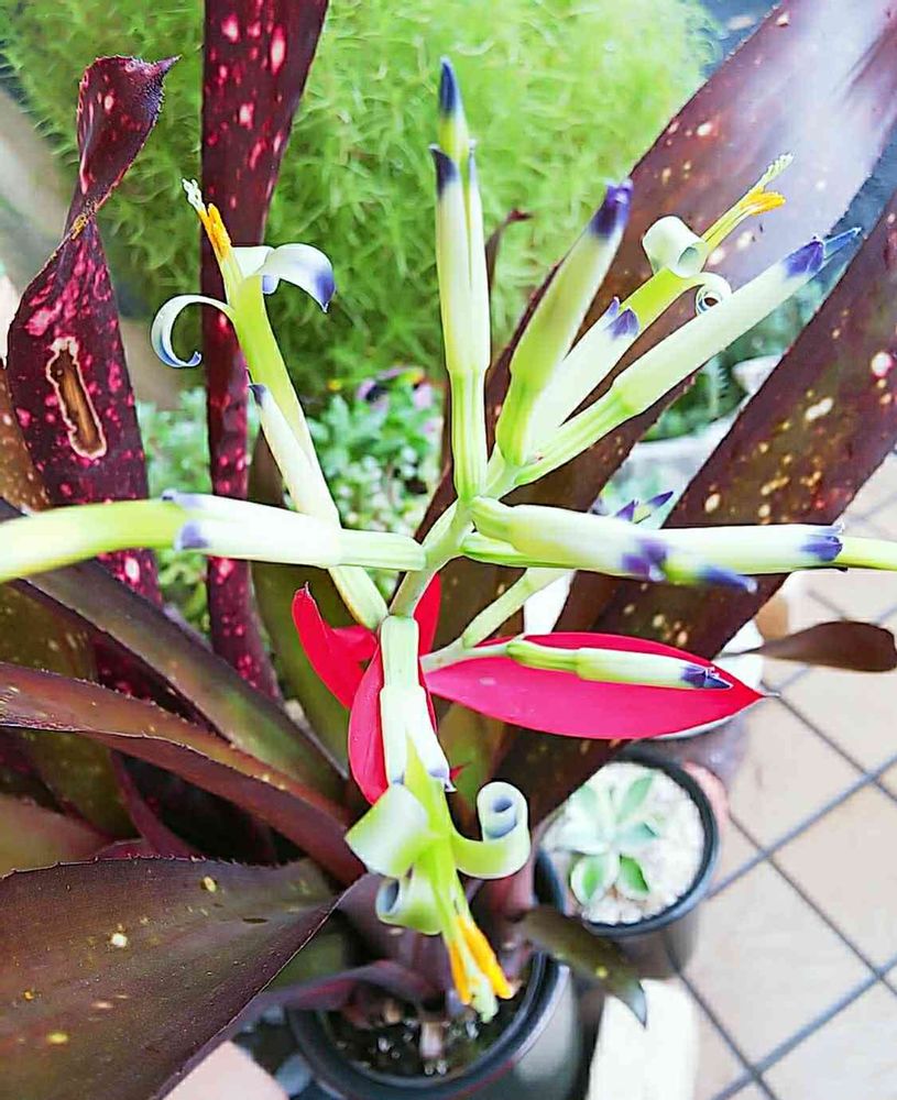 変わったお花だね〜🥰くるりんっがかわいいね😍 タンクブロメリア ハレルヤ またなんと粋なおなまえ💕😆♬