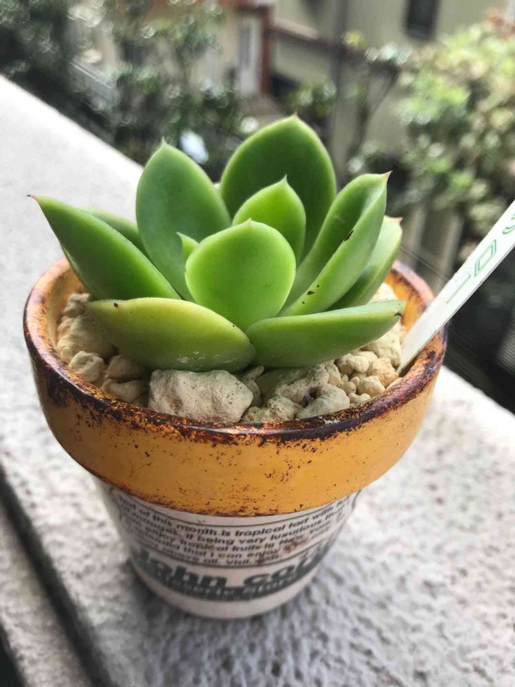 黄緑色の葉っぱと黄色いリメ鉢がマッチしてる。