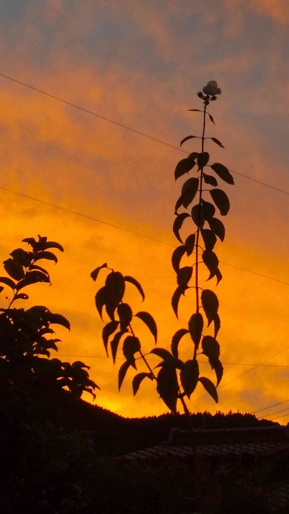台風の後の夕焼けに、狂い咲きした真っ白な卯木。