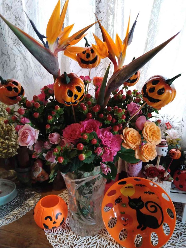 お庭のストレリチアさんをちょいとお花を足して一緒に飾ってみました🎃ハロウィンバージョン🎃👻🔮🍭🍬
