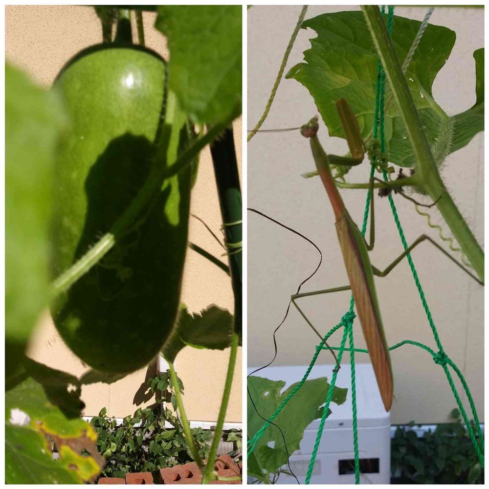 今朝見かけた、苦手な「カマキリ」と20cm程に成長した夏野菜の「冬瓜」😥