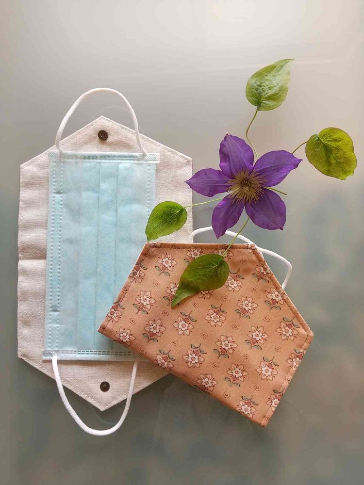 布の上にマスクを置いて二つに折り、マグネットホックで留めるマスクケースを作りました😷