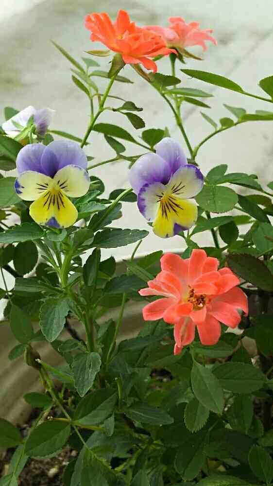 サーモン色したミニバラさんが咲いてくれて📷写した後、見ていたら バレエをしてるかのように見えビオラさんは歌ってくれてるのでしょうか?そんな風に見えました😊