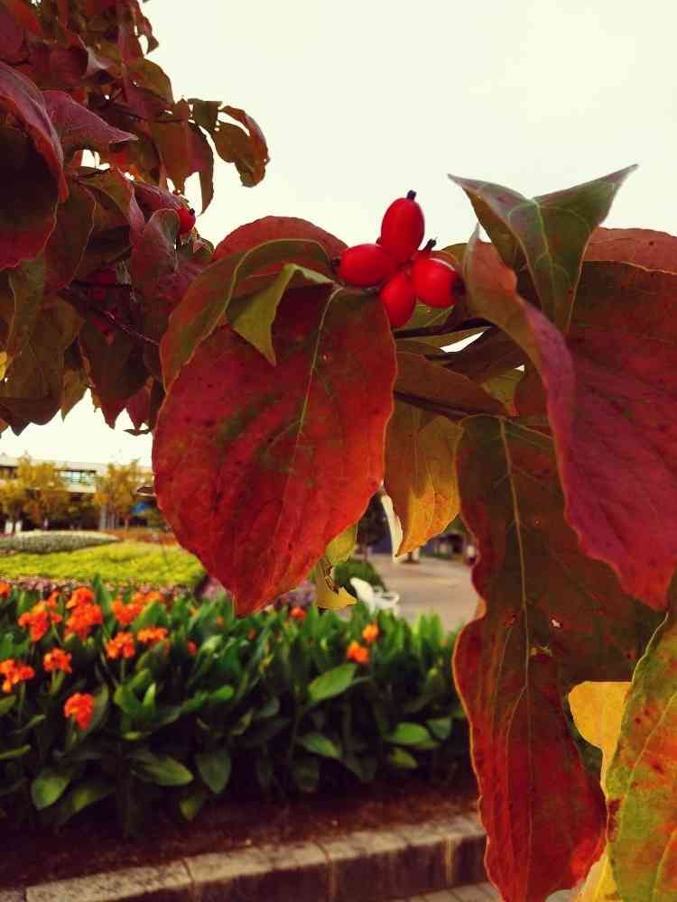 赤く色づいた🍁ハナミズキの葉っぱ🍃と実