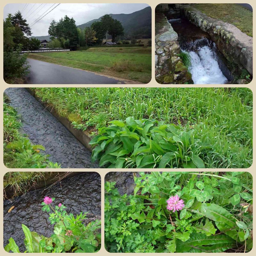 岩原村の大庄屋 山口家の庭から湧水が勢いよく流れ出て 広大な田圃脇を流れています。