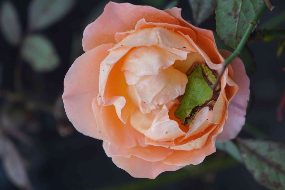 先日 寒い早朝 バラの中で寒さをしのぐアマガエルを発見