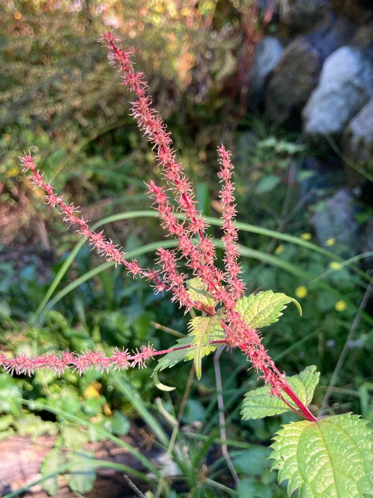 キレイな赤色の穂です。背丈が低めです。シソみたいな葉っぱは、3つに割れてなく先っちょがトンガってるので、アカソではないみたいです。