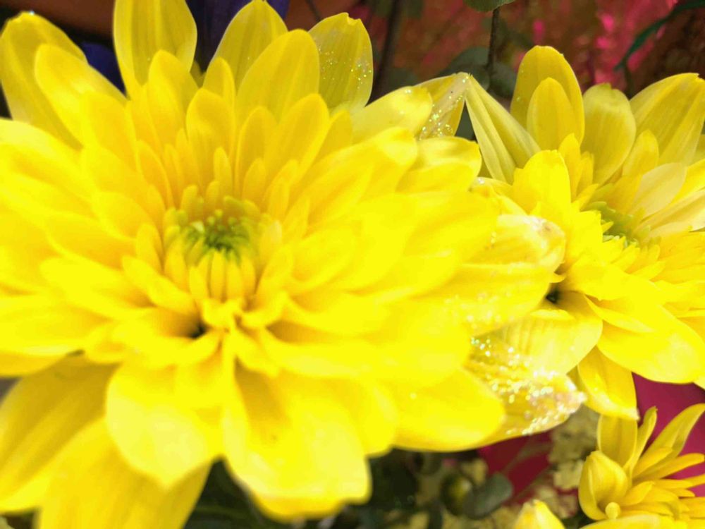 キラキラマム、菊でしょうか🏵以前に青色の色違いをお迎えしましたが、今回は黄色にしました☺️💗お花屋さんで、売られている時からキラキラのラメを花びらに付けて下さっています。菊はお仏壇に飾るものと思っていましたが、お洒落で違ったものに見えて普通に飾ってもGood👌ですね