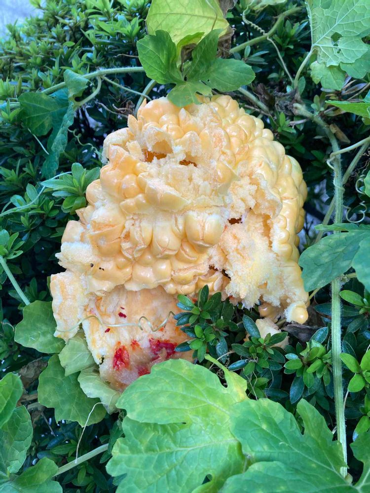 😱ゴーヤ白、緑とも1個ずつ完熟爆発してました…。つつじの影になってて気づかなかった…。種とりました。