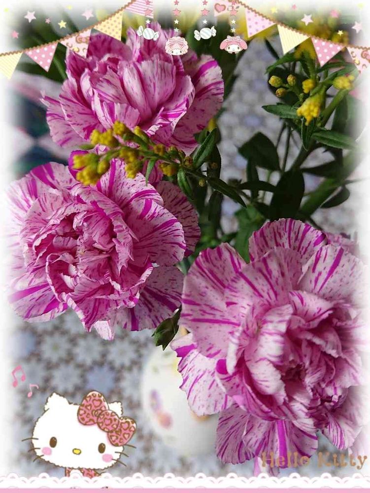@みゆ みゆチャン 今晩は。キティちゃん可愛ですねー❣ 変わったカーネーションさんね。班入りが素敵! 今日もお疲れ様でした。明日も頑張りましょうね。宜しくです。♥️🐰☺️