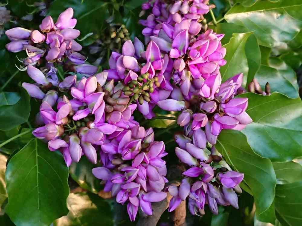加工してません。西日で明るいピンク色に見えますが、実際は赤紫と紫色が混ざったような花でした。紫色で探したから花名見つからなかったのかな~🤔