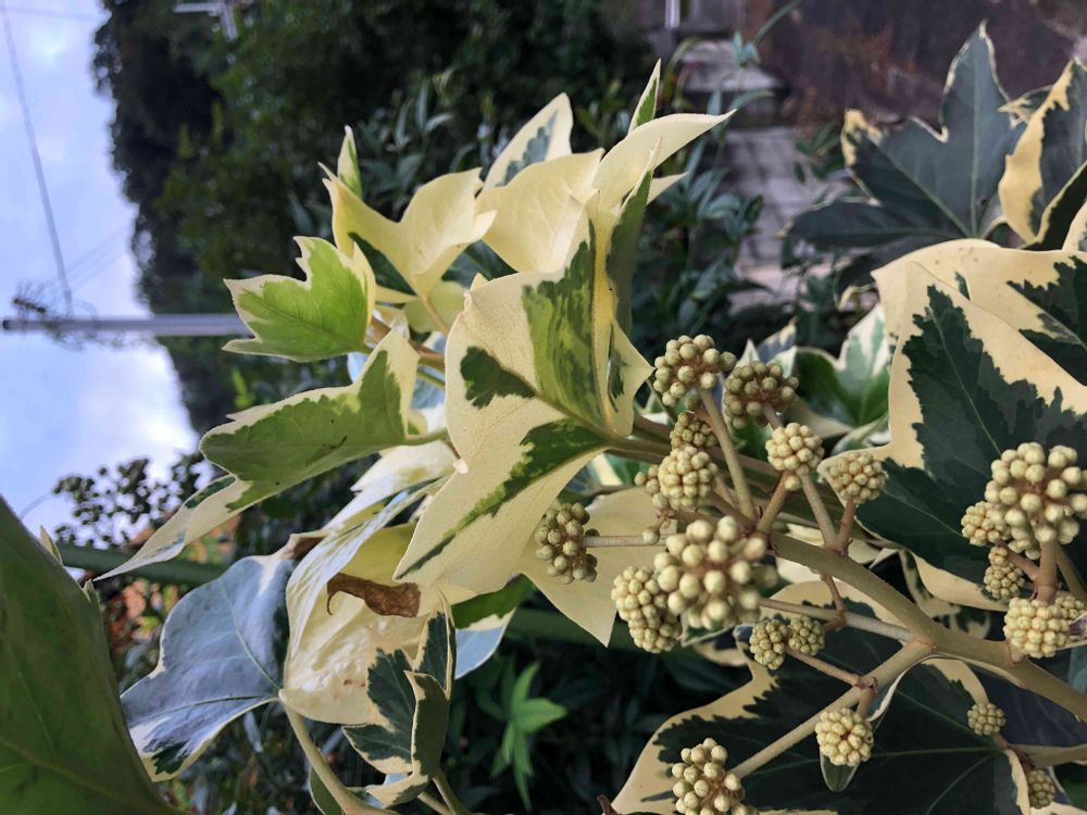 ヤツデにしては葉の切れ込みがあさいので、ヤツデとヘデラの異種交配種のファトスヘデラではないかと思いました。