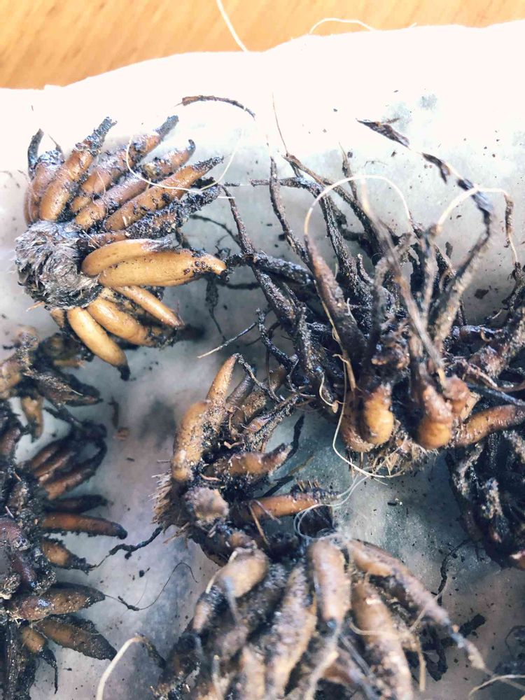 掘り起こした球根を濡らしたキッチンペーパーで包みジップロックへ。