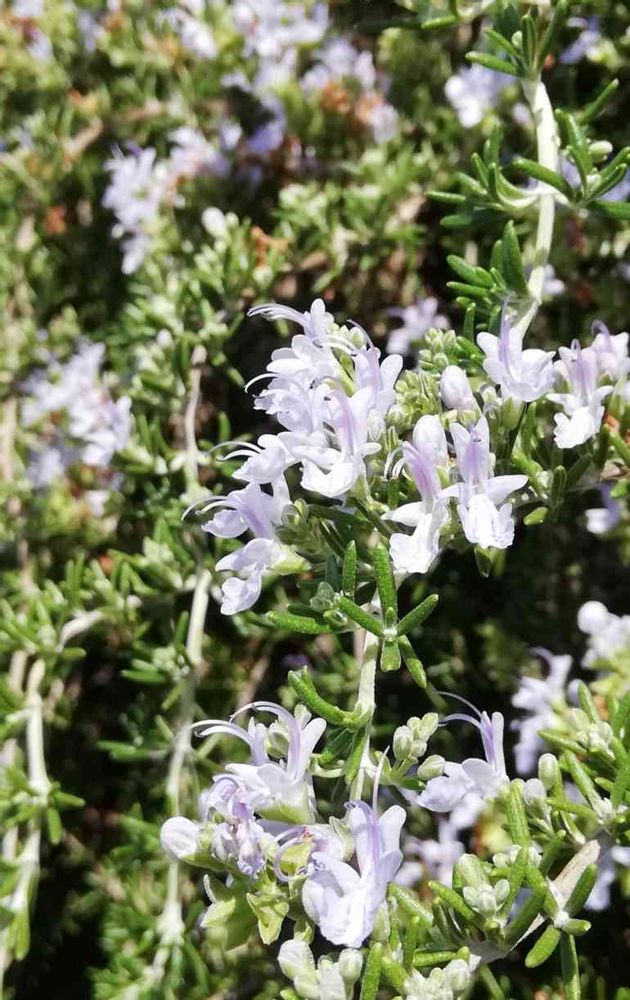 ほふく性ローズマリーが庭柵を覆い尽くし、花がたくさん咲いています。