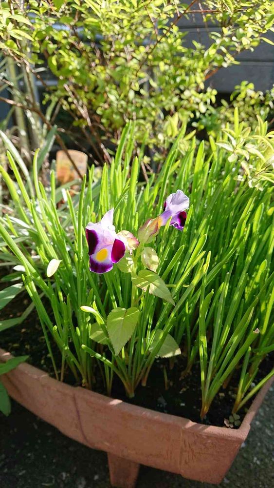 ムスカリの葉の中に、何故かトレニアが…👀ご近所さんのトレニアの種が飛んできて咲いてくれたようです(笑)