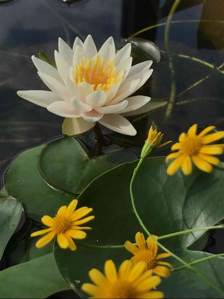濃緑の葉を背景に姫睡蓮さんのクリーム色の花色と、黄色のコラボが素敵ですね💚💛✨