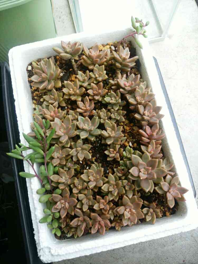 お洒落感ゼロの発泡スチロール葉挿しポイポイ箱で順調に成長中🙆