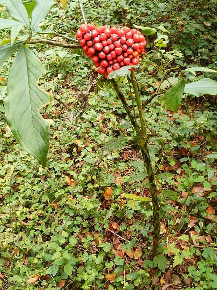 大きなマムシグサが生えていました。赤い実の下の黒い所がビニールみたいにピカピカしていました。