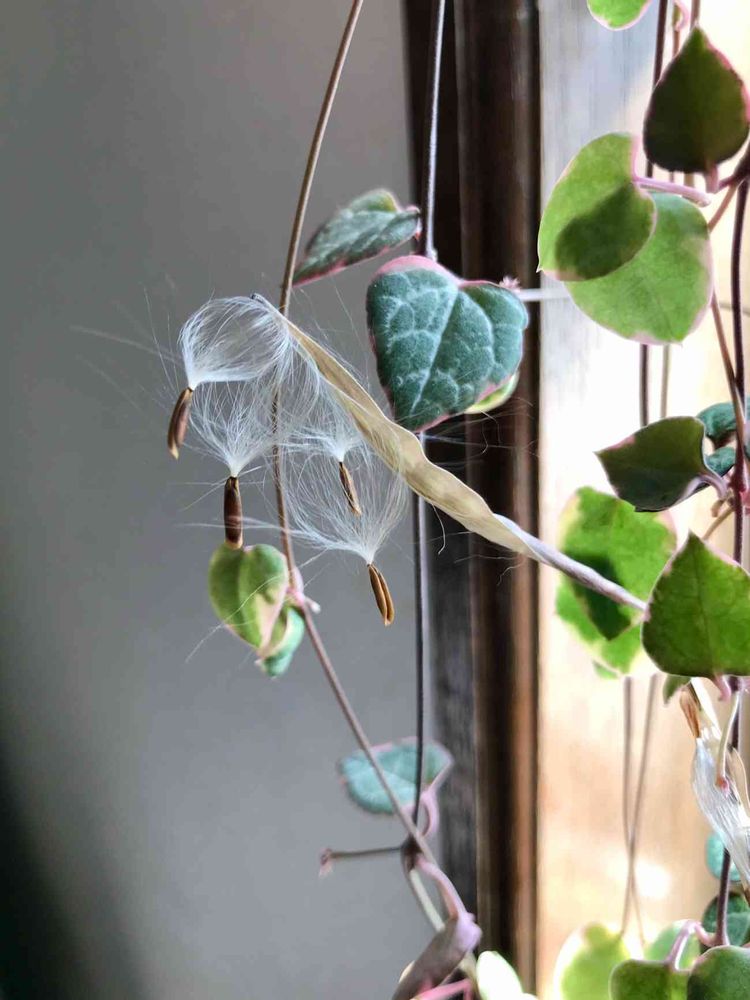 窓べをふと見るとハートカズラのさやからたんぽぽの綿毛の様な種が…💕