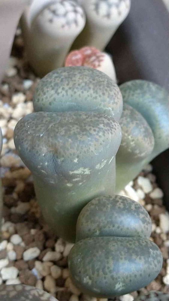 この三つ子のリトープスに白い斑点模様があちこちに💧真ん中のやつは凹んでるし(((٩(๏Д⊙`)۶)))