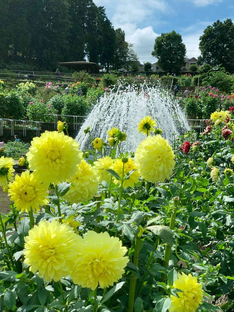 このpicはまた、青空に噴水⛲️がバックで、黄色のダリアが爽やかで元気パワーもたくさんもらえました✨🎶