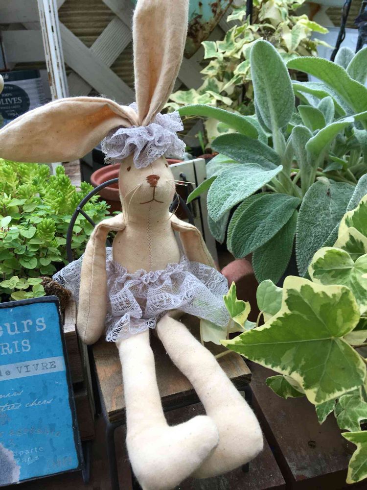 緑が多くなってきたベランダで。ラムズイヤーガーデン成長著しい。ラムズイヤーにちなんで、ミニうさぎとパチリ。どっちが主役?