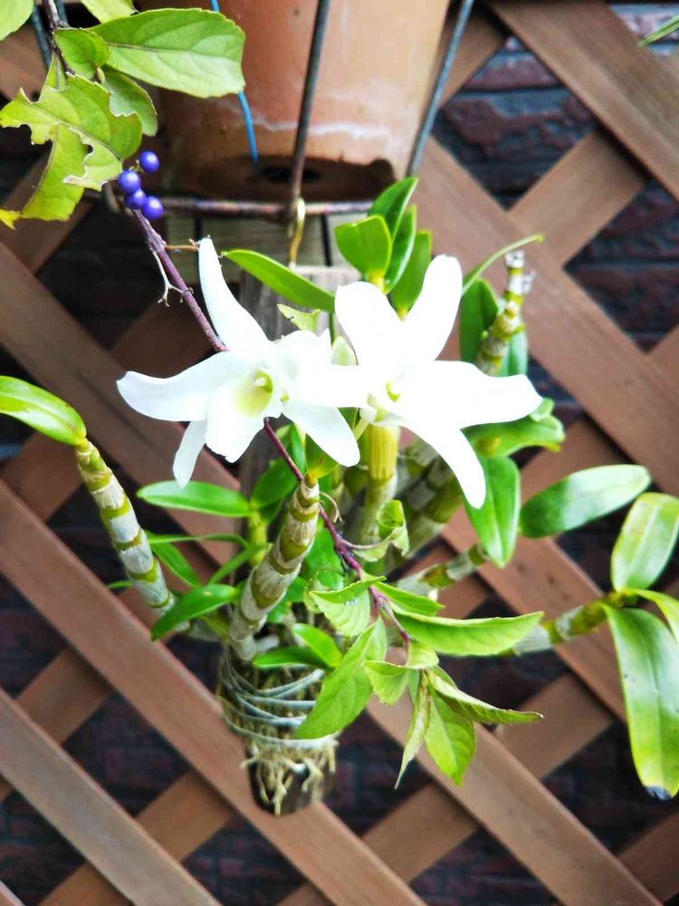おはようございます☁️デンドロビウムとムラサキシキブ(📷️もう少し紫だが🙇)流木に植え替え二ヶ月、こんなに早く咲きました。今日この子お婿(嫁ぎ)さんに行きます😃 追伸😘16:25流木キンギアナムと旅立ちました。幸せに😆🌼🍀