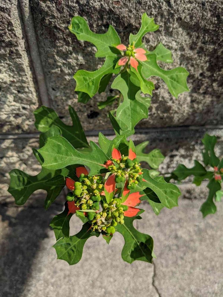 ガレージのブロックの隙間に根付いた🏵ショウジョウソウの花🌺