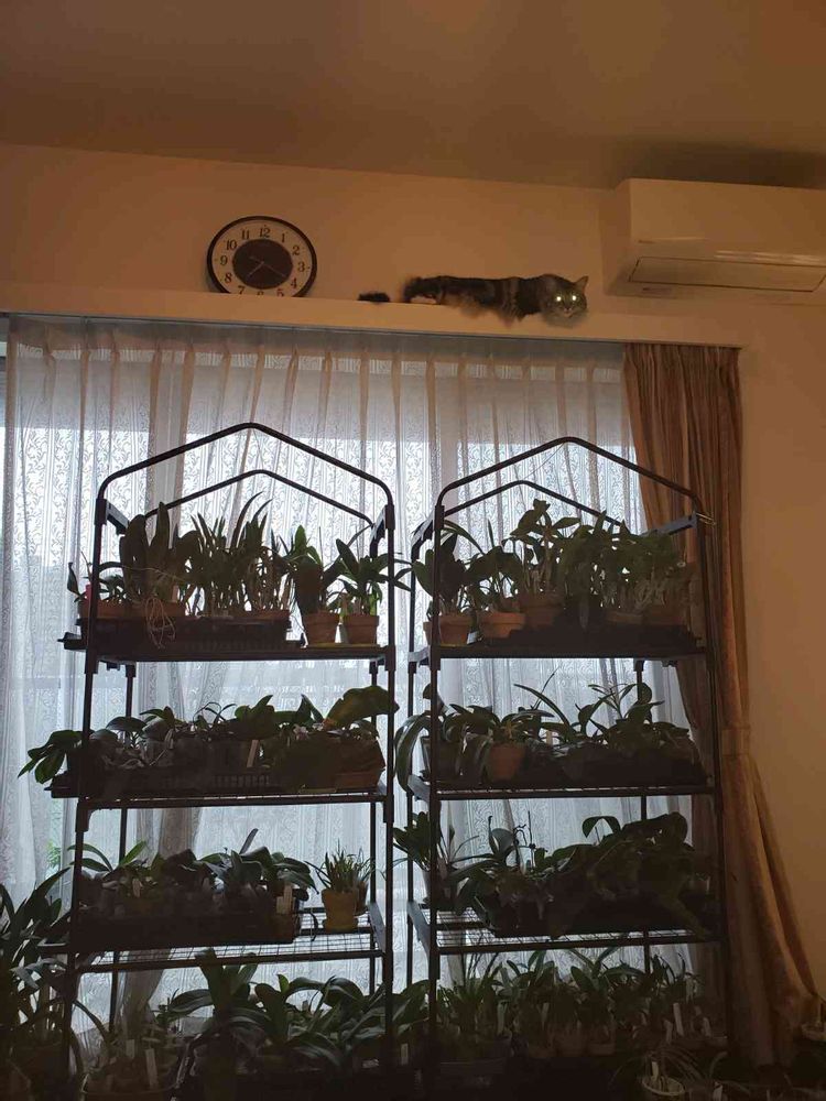 調子にのってフラッシュをたいて撮影すると、ラン棚の上に宇宙生物が現れた!😼😽😅