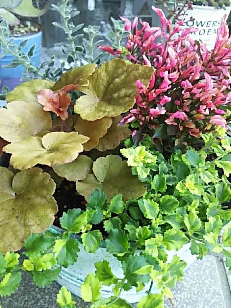 ヒューケラも色違いで寄せ植えしたことあります。葉っぱだけでも楽しめます。