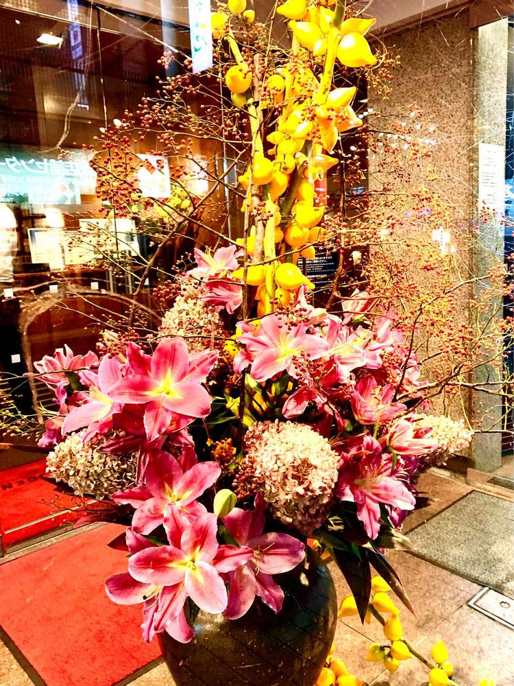 某焼肉の入り口に飾られた盛花🌸🌼🌺