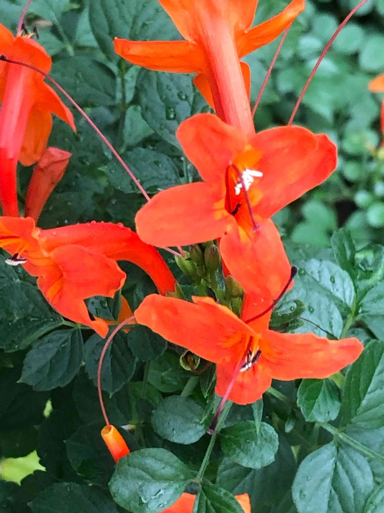 歩道沿いの生垣で、橙色の花びらと丸葉を付けた花を見つけました。「ヒメノウゼンカズラ」のようです。ノウゼンカズラ科ヒメノウゼン属で、南アフリカが原産地。花の色はノウゼンカズラ(原産地は中国)と似ていますが、5枚の花びらが完全に分離している点が異なります。別名「テコマリア」。