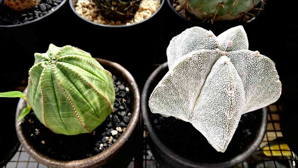 サボテン科 アストロフィッツム属 恩塚ランポー玉と、トウダイグサ科 ユーフォルビア属 オベサ。🐱🐱