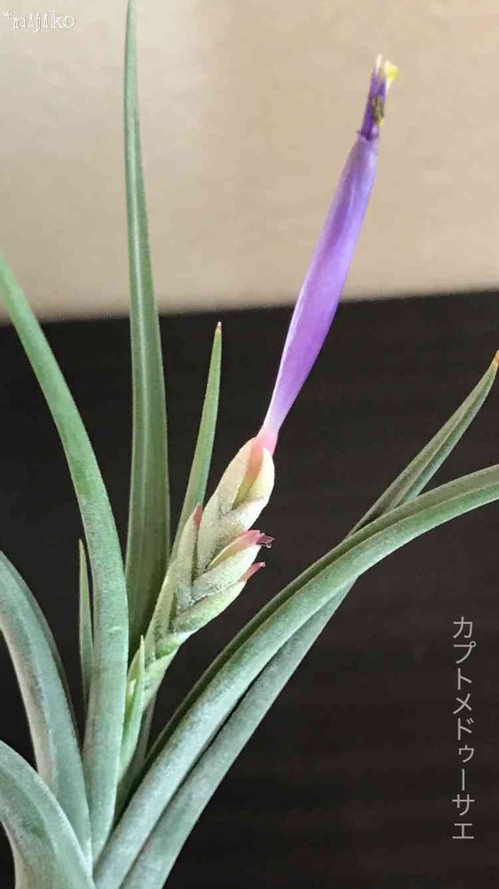この子は真っ直ぐ花 咲かせましたが 途中で方向転換して 花じゃなく 子株をつけ始める子もいます〜チランジアちゃん ひと筋縄では行かないですね(ノ´∀`)ノでも そこも面白くて 好きかも💕🎶