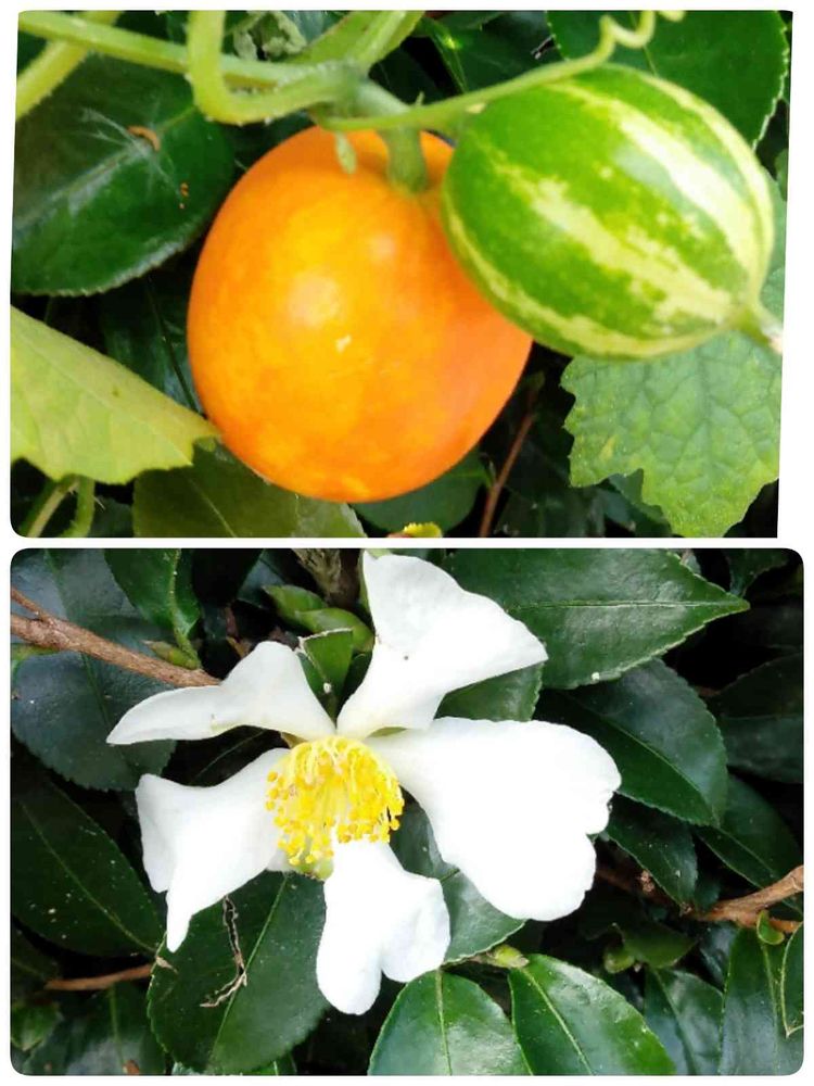 山茶花が咲き出しました!カラスウリが山茶花の木に巻きついて、たくさん実を付けています!